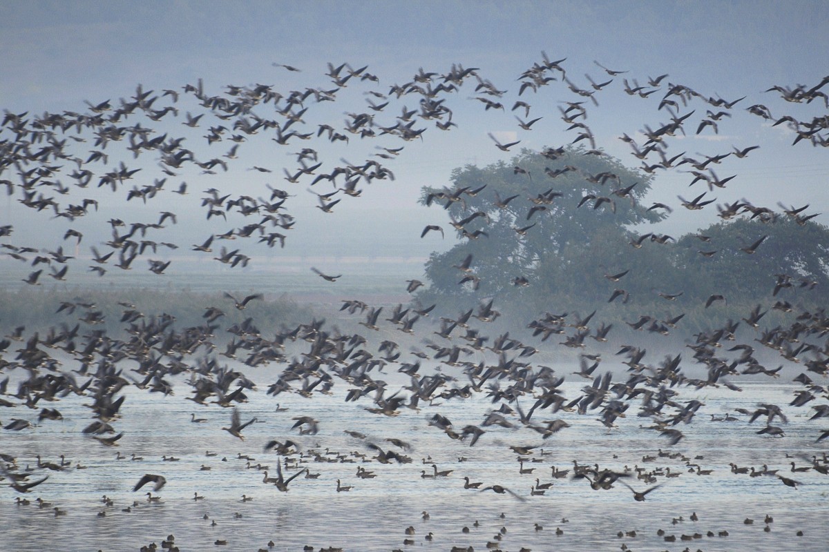 At dawn the geese all launch back into the sky in a moment of avian chaos. The first time I saw it I thought there had been an explosion, but it was the sound of 70,000 geese all taking off simultaneously. Soon the whole flock is swooping away over the fields in search of food again.