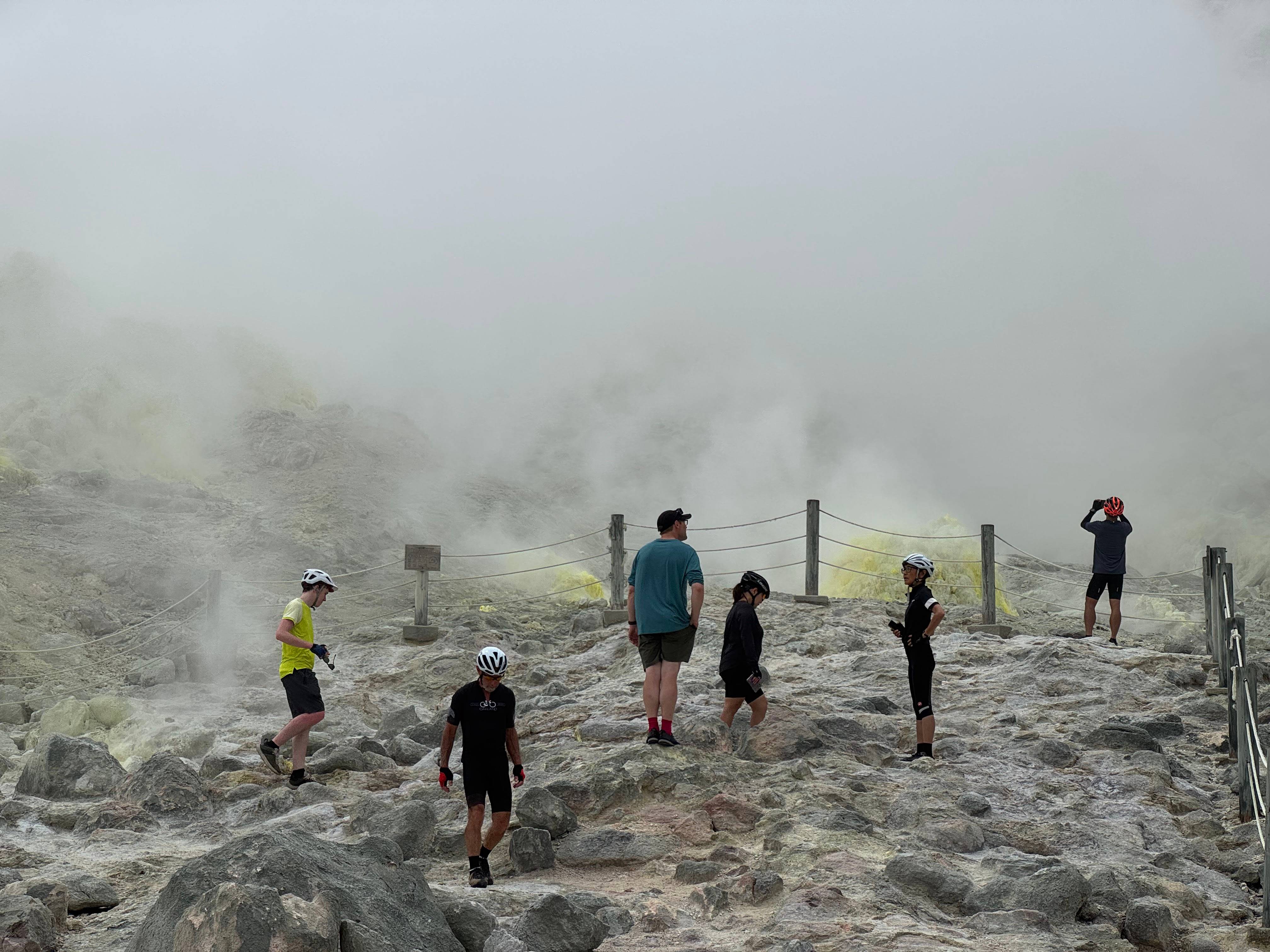 We cycle to Mt. Io (Sulphur Mountain), an active volcano that last erupted 600 years ago. Today, it still emits impressive clouds of sulphuric steam, with steam vents stained in vivid yellow.